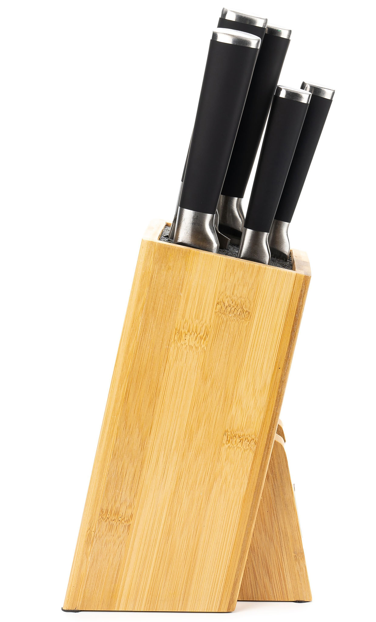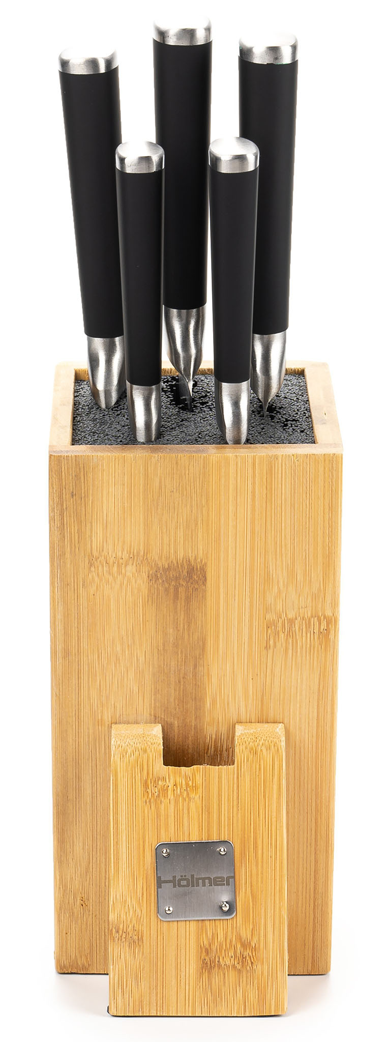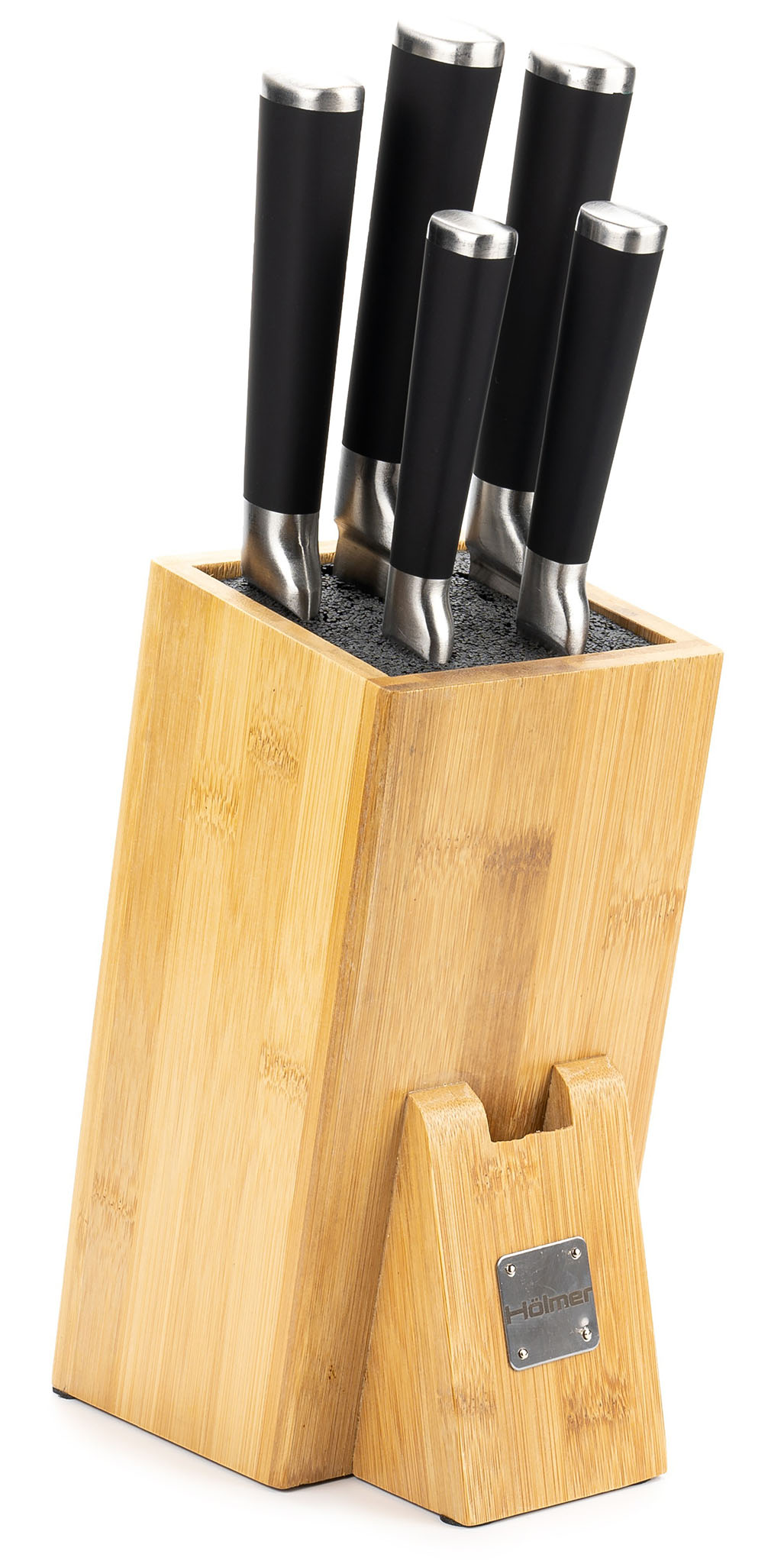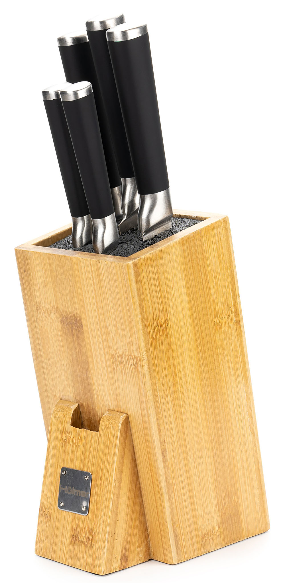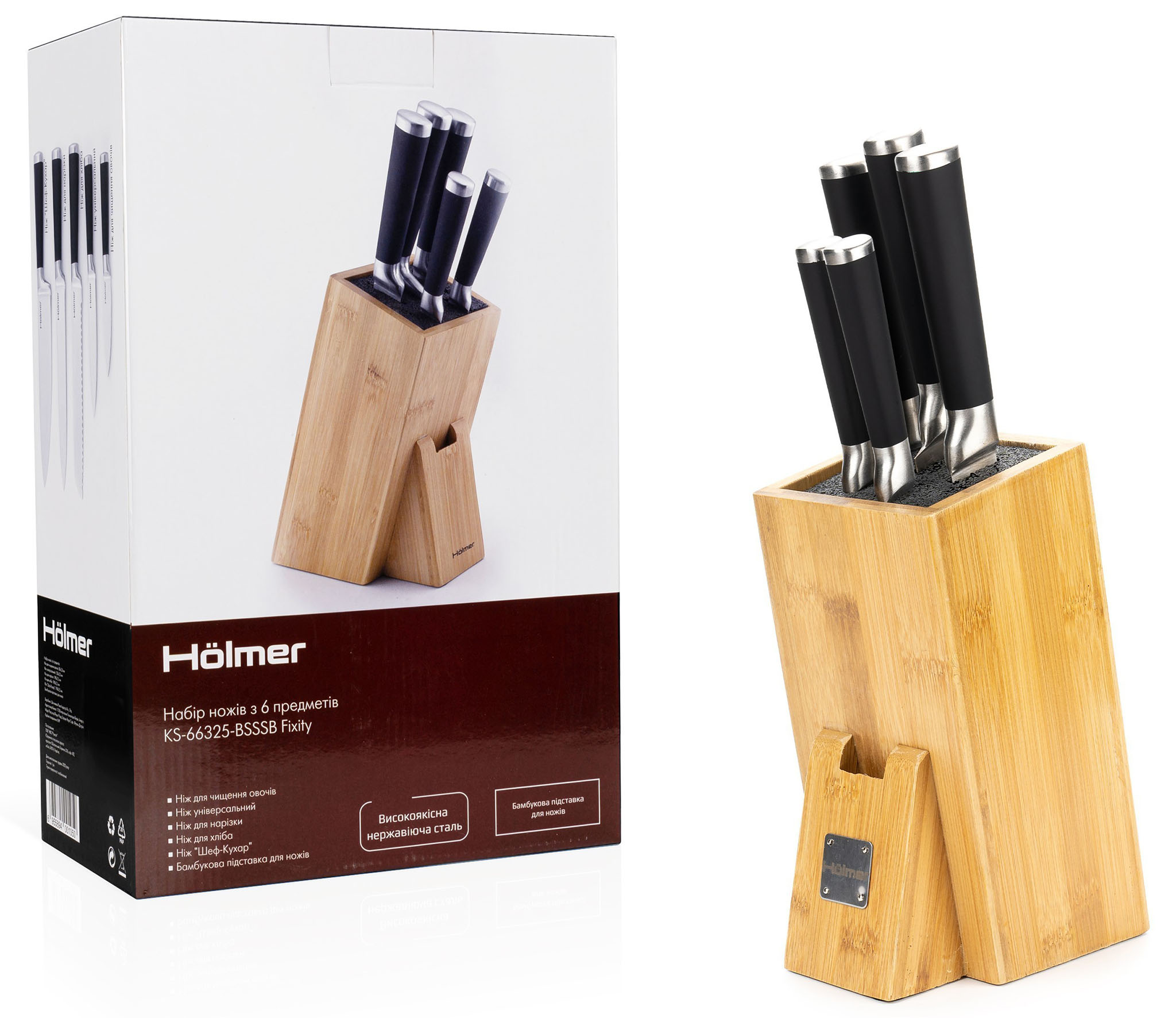 Набір ножів Hölmer KS-66325-BSSSB Fixity складається з 6 предметів — п'яти ножів різного призначення з лезами з високоякісної нержавіючої сталі, які стануть ідеальним варіантом для нарізування різноманітних продуктів на вашій кухні, а також зі зручної бамбукової підставки.