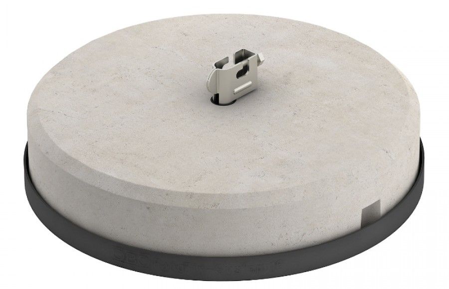 Бетонна основа для системи FangFix (5403200) використовується для утримання блискавки приймального стержня в нерухомому стані. Має вагу 16 кг, номінальний розмір діаметра 373 мм і затиск FangFix з нержавіючої сталі VA.