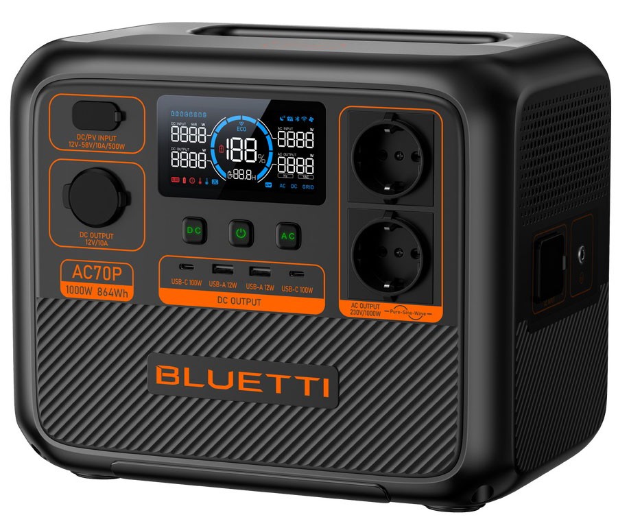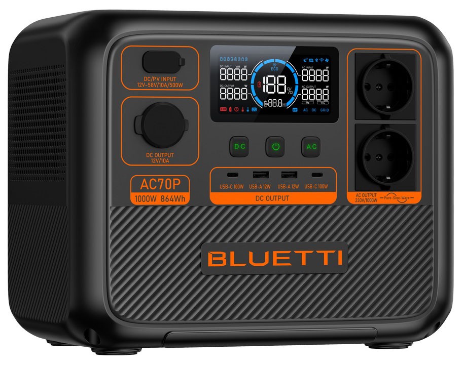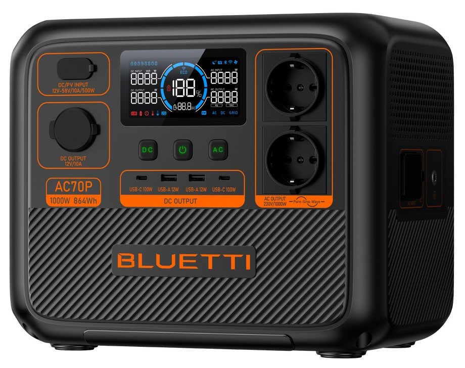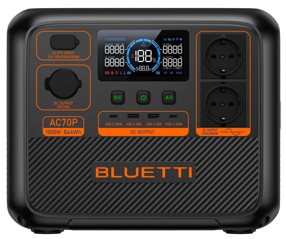 BLUETTI AC70P - це портативна електростанція, яка вражає своєю потужністю та інтелектуальними можливостями. З номінальною потужністю 1000 Вт та піковою 2000 Вт, ця електростанція стане невід'ємним компаньйоном для подорожей та використання в побуті.