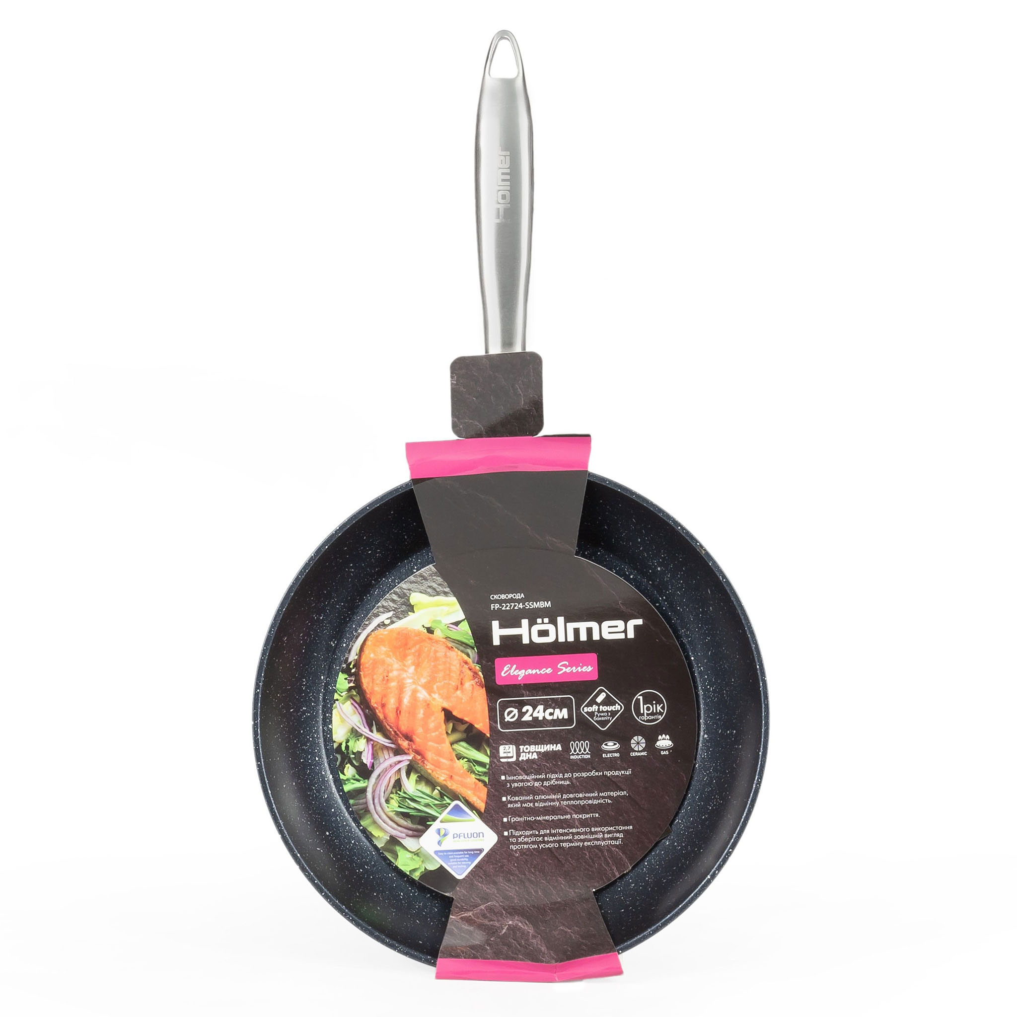 Сковороди Hölmer серії Elegance - це посуд, який має стильний дизайн, антипригарне покриття PFULTON. Тришарове мармурове покриття має чудові експлуатаційні характеристики. Використання спеціального крапельно-дисперсного нанесення фінішних шарів створює унікальне по структурі тришарове покриття з ефектом мармуру.