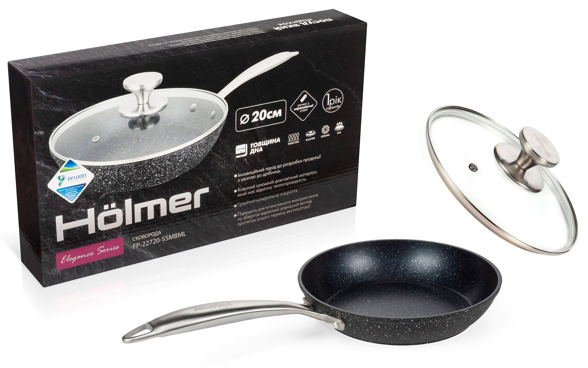 Сковороди Hölmer серії Elegance - це посуд, який має стильний дизайн, антипригарне покриття PFULTON. Тришарове мармурове покриття має чудові експлуатаційні характеристики. Використання спеціального крапельно-дисперсного нанесення фінішних шарів створює унікальне по структурі тришарове покриття з ефектом мармуру.