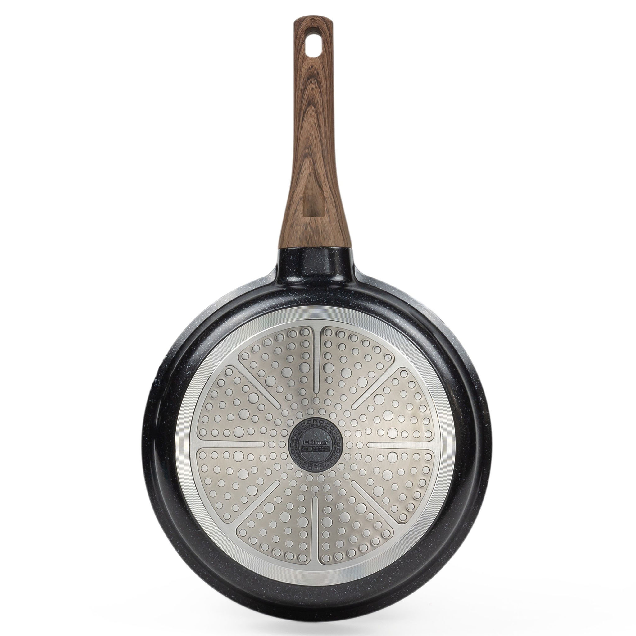 Сковороди серії Nature виготовлені із літого алюмінію, товщиною 3,5 мм, ця сковорідка нагрівається швидко та рівномірно. Що значно прискорює процес приготування, а також перешкоджає пригоранню і нерівномірному просмажуванню продуктів.