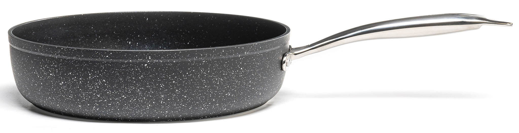 Сотейник оснащений ручкою з нержавіючої сталі, яка забезпечує міцність, стійкість та комфортний захват під час використання. Вона не нагрівається, що дозволяє безпечно маніпулювати сотейником під час приготування.